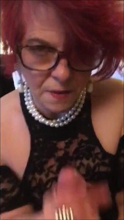 Redhead grandma with glasses giving a sloppy blowjob