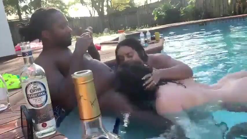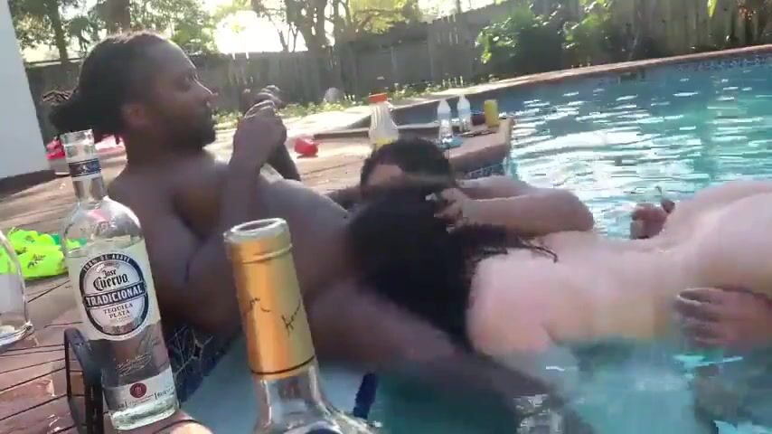 Seductive white babes suckinbg one hard black cock in the swimming pool